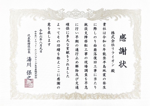 令和6年能登半島地震の災害復旧作業で社長表彰をいただきました。