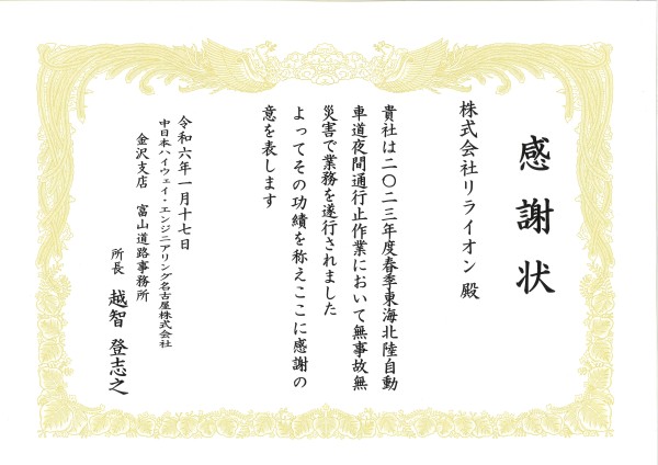 「2023年度春季東海北陸自動車道夜間通行止作業」において感謝状をいただきました。
